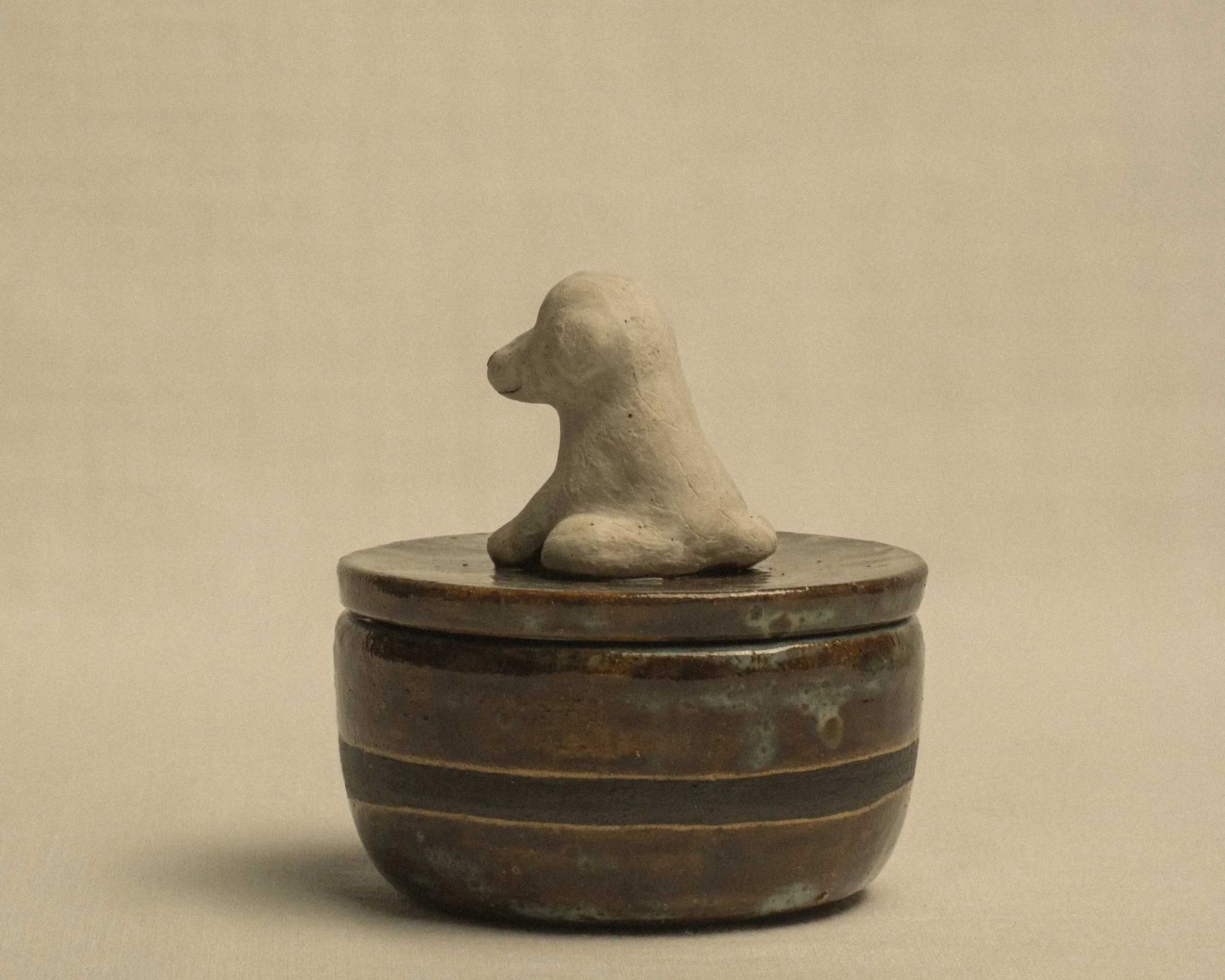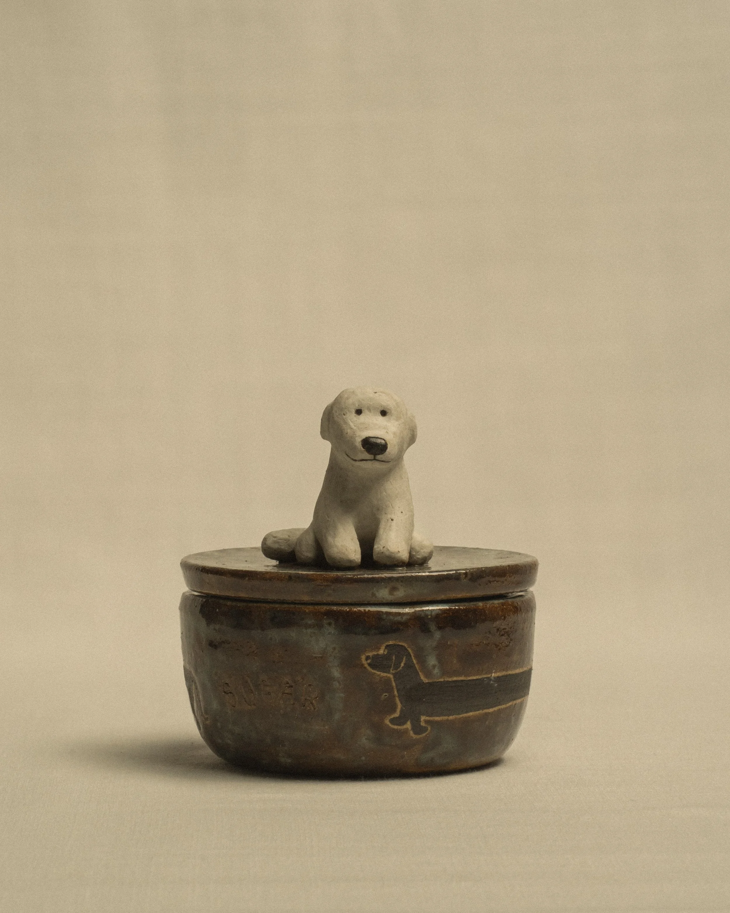 Very fun, and open-ended request to create a sugar bowl with a lid that includes the client’s 2 dogs on it. Hand-building the fluffy pup + drawing the weiner dog across the bowl was a fun way to include 3D and 2D into the piece.